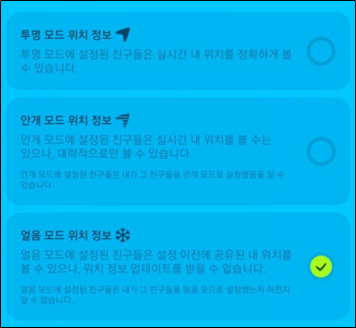 얼음모드는 마지막 위치 정보를 마지막으로 더이상 나의 위치를 업데이트하지 않는 기능입니다. 이때 얼음 모드는 지도 핀이 마지막 위치에 고정되기 때문에 친구들이 내가 얼음모드로 설정한 사실을 알 수 없어 편리합니다.