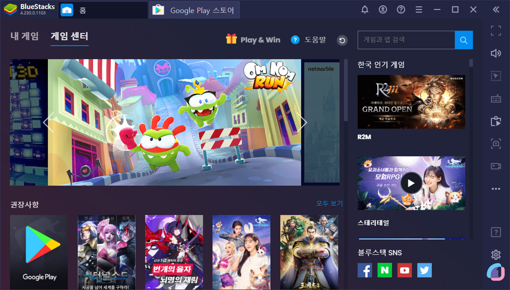 설치가 완료된 모습입니다. 여기서 내 게임 또는 게임 센터를 이용해 게임을 다운받으실 수 있습니다. 저는 모바일게임 추천 중 하나인 AFK아레나를 설치해 보겠습니다.