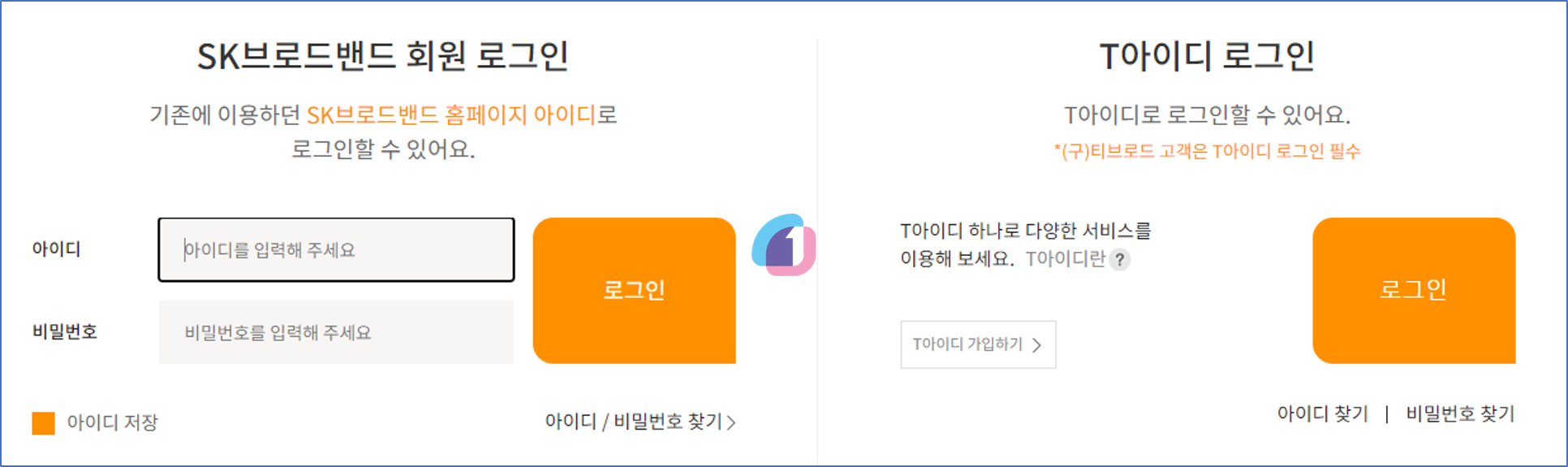 SK브로드밴드 아이디나 T아이디로 로그인 하셔야 하며, 반드시 "명의자" 아이디로 로그인하셔야 합니다. 만일 아이디가 없으시면 회원가입을 하셔야 합니다.