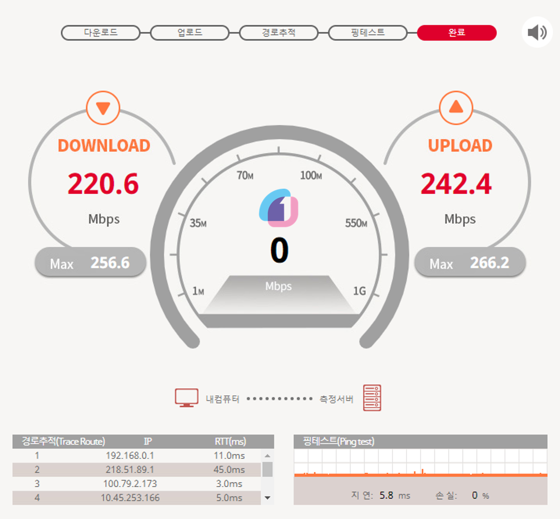 설치가 완료되었다면, 페이지의 새로고침을 한 번 해주시면 드디어 속도측정이 시작됩니다. 1분 정도 기다리면 됩니다. 저는 다운로드/업로드 220.6/242.4 Mbps가 나왔네요.