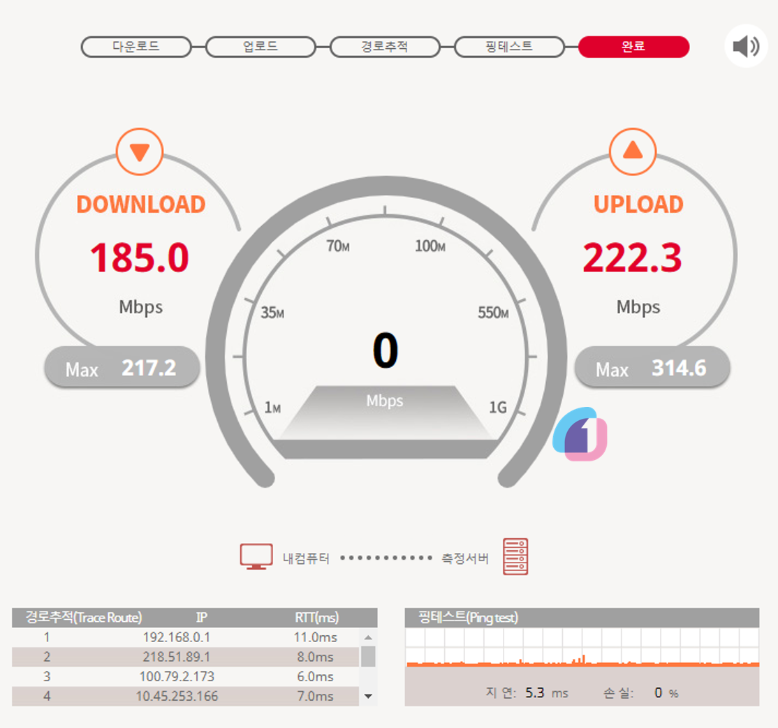이상하게도 SKT 측정결과랑 조금 다르네요. 아침 시간이어서 가족들이 핸드폰을 안 쓸 줄 알았는데 쓰고 있어서 조금 느리게 나왔을 수도 있겠네요.