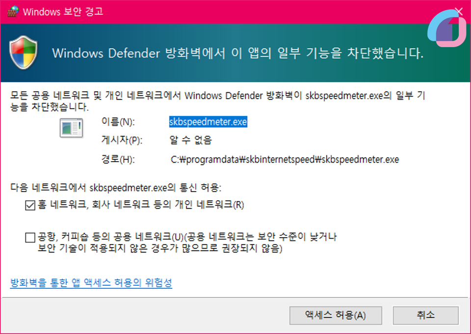 속도측정 프로그램이 방화벽 권한을 요구하는데, "액세스 허용"을 눌러서 허용해주세요.