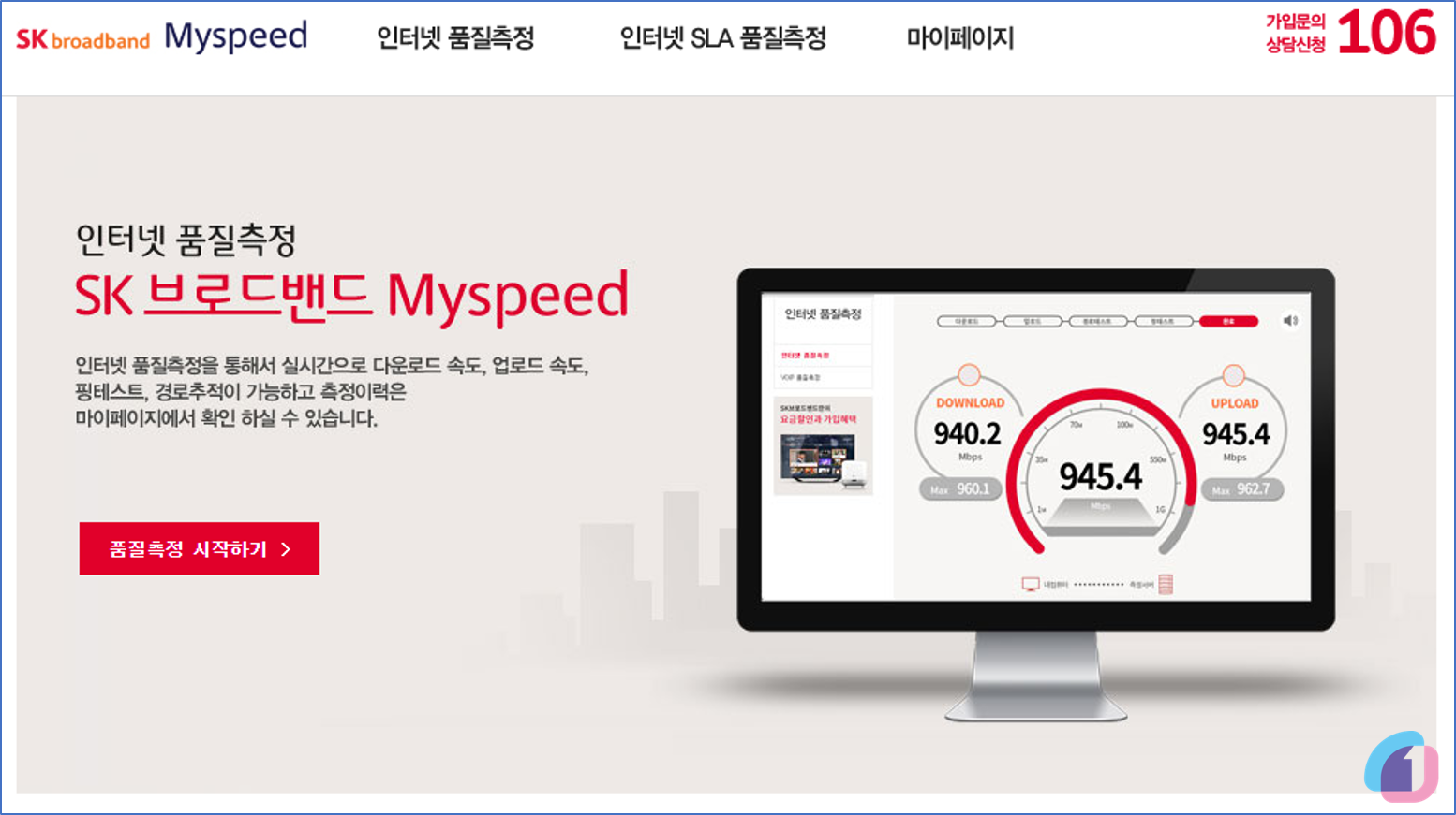 SK브로드밴드 사용자의 경우는 아래 링크를 클릭하시면 품질측정 페이지로 이동됩니다. 이동 후에 "품질측정 시작하기"를 눌러주세요.